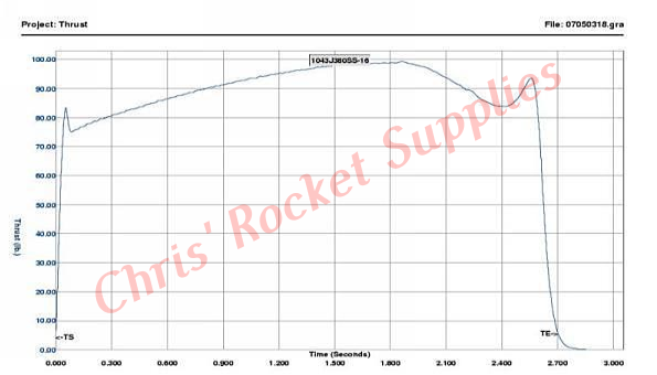 Brandname | Pro54 1043J380-16A | Manufacturer | Cesaroni Technology | Man. Designation | 1043J380-16A | CAR Designation | 1043-J380-16A | Test Date | 7/6/2003 | | | Single-Use/Reload/Hybrid | Reloadable | Motor Dimensions mm | 54.00 x 320.00 mm (2.13 x 12.60 in) | Loaded Weight | 1293.30 g (45.27 oz) | Total Impulse | 1043.00 Ns (234.68 lb.s) | Propellant Weight | 769.00 g (26.92 oz) | Maximum Thrust | 434.60 N (97.79 lb) | Burnout Weight | 482.40 g (16.88 oz) | Avg Thrust | 382.00 N (85.95 lb) | Delays Tested | 23 - 6 secs | ISP | 138.30 s | Samples per second | 1000 | Burntime | 2.73 s | Notes | Smoky Sam™ |