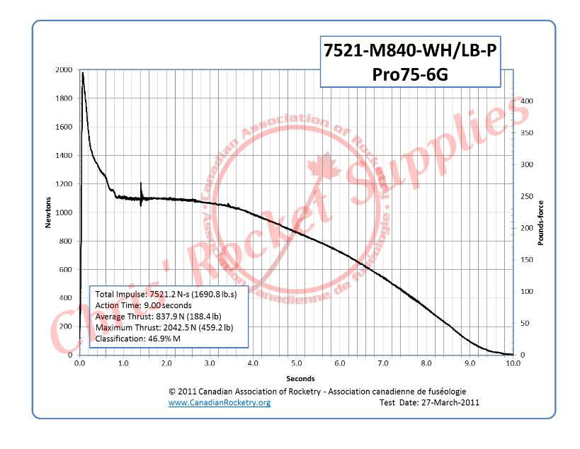 Loaded Weight | 6954 g | Total Impulse | 7521.2 Ns (1690.8 lb-s) |